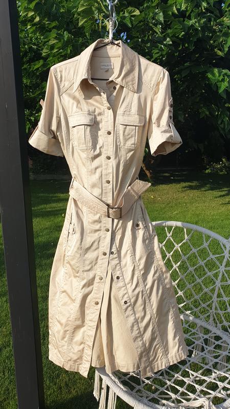Классическое платье-рубашка в стиле сафари от Karen Millen. Хорошее состояние, брендированная фурнитура, пасок в комплекте. Размер UK12 (ближний к М). Замеры: п/о грудь 47 см, талия 41 см, бедра 50 см. На фото нагнуто на параметры 91-73-100. Ткань коттон с эластаном, красиво тянется. Присутствующие малозаметные дефекты ткани вокруг нескольких кнопок, но, учитывая структуру и цвет ткани, их в носу не видно (последнее фото крупным планом). Цена такого же на реси-платформе на предостановочном фото. Цена для платья просто символична.