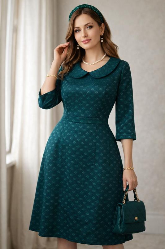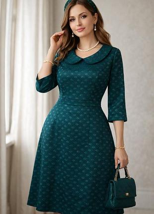 изумрудный цвет, ткань в кленовый листочек длина 95 пог 50 пот 46 поб 60 рукав 3/4 на спине молния 40 на подкладке