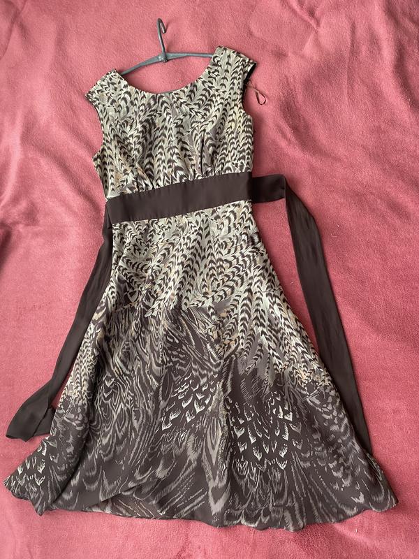 Сукня в неймовірний природний принт (пірʼя), з вшитим поясом та ґудзиками по спинці. Юбка вільного крою, напівобхват талії 36 см, напівобхват грудей 40см.