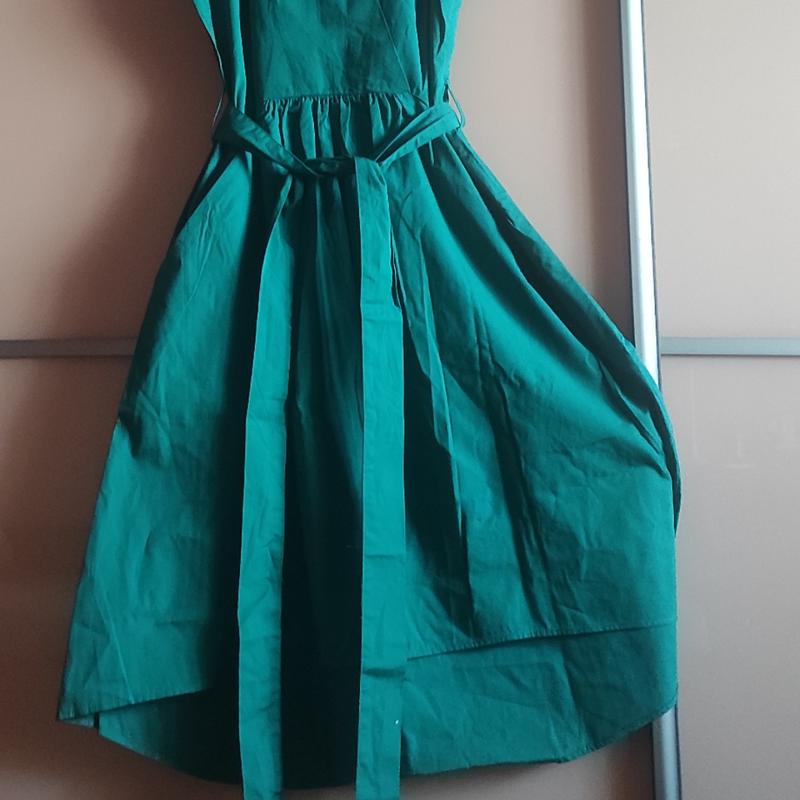Платье из натуральной ткани, спереди короче, сзади длиннее, с боку застегивается на молнию, карманы, простое и изысканное в идеале, длина по спинке 112 см, спереди длина 100 см, ПОГ 47 см, может быть больше за счет запаха, ПОТ 43 см регулируется поясом