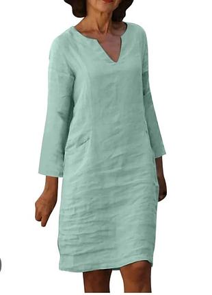 Великолепное летнее платье 100% льна. Свободный крой. Рукав можно подвернуть. Нежного цвета мяты. Длина 100 см. Ног 56 см. Нот 58 см. Нос 65 см. Рукав от горловины 70 см.