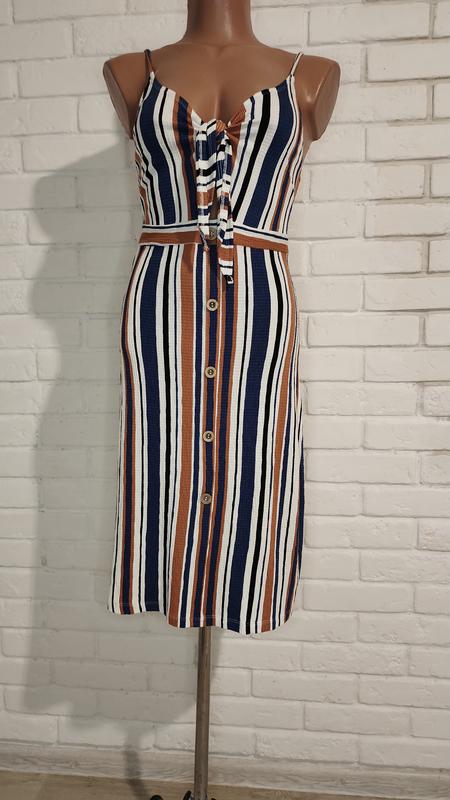 Платье в полоску, S.Сукушка меди в полоски разных цветов от Love Tree, спереди имитация застежки на пуговицы, размер S, на бретелях они регулируются, спереди верх на завязке, в идеальном состоянии. Замеры НПО груди 36-47 см., НПО талии 32-45 см., НПО бедер 41-55 см., длина 93 см.