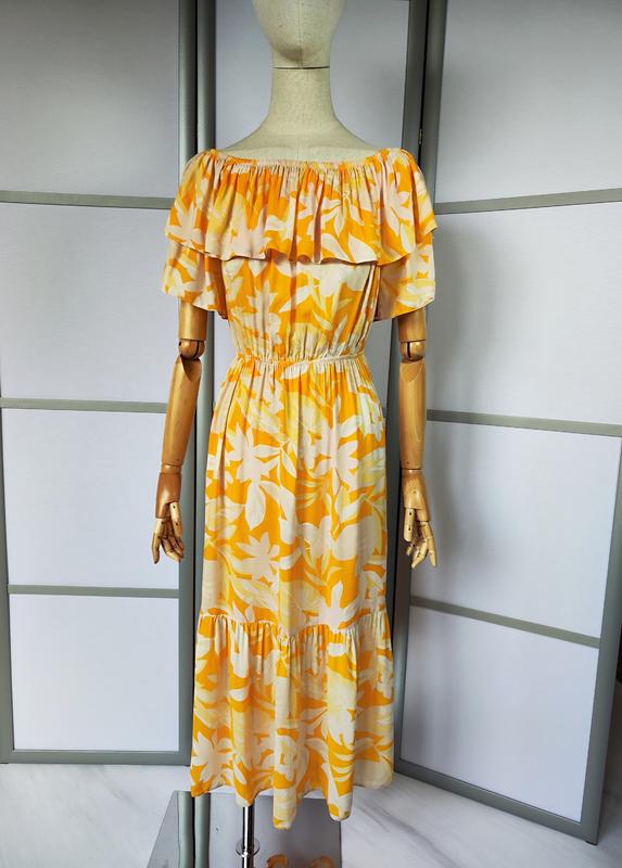 Сказочное платье миди от GEORGE из 100% вискозы По горловине и плечам резинка с оборкой, объемные рукава, по талии резинка, юбка с оборкой Идеальное состояние Размер UK 14 длина от плеча - 125 от плеча до талии -41 полуобхват в груди -бл.64 свободно в талии -36-56 полу охват в бедрах -62 вил горловины до конца рукава -24 Возвращение не предусмотрено