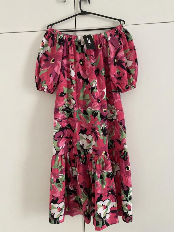 Яркое натуральное платье со спущенными плечами . Длина 110, пог 57, пот 61, по резинке в свободном состоянии 46