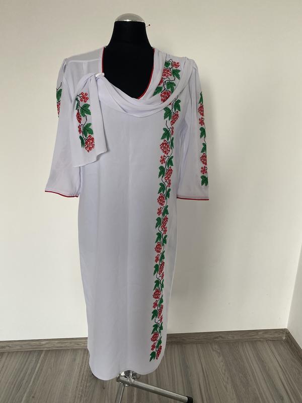 Платье вышитое, орнамент калина, модель приталенного кроя, вышивка размещена вертикально по всему платью, на рукавах и шарфи. Выглядит очень красиво и нежно. На спинке-молния.