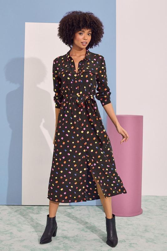 платье рубашка миди в разноцветный горох love and roses Сток с сайта некст, идет без бумажных бирок Uk 12 Длина 129 Пог 45-47 Пот 35-45 Вискоза-100%