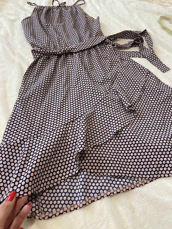Платье в идеальном состоянии Очень удобная, легкая, на лето прекрасный вариант Размер С-М Идеально садится на М Длина меди, указанная на фото Спереду наче на запах, але зшито На талии резинка и пояс завязывается. Длина бретель регулируется и сзади завязывается