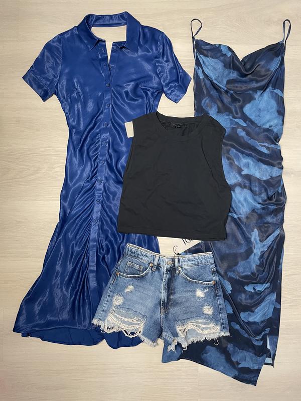 1. Насыщенное синее платье-рубашка миди длины с открытой спиной. Длина 115 см, плечи 34 см, размер XC. 659 грн 2. Синее платье на бретелях в узор «облака». Чашки держат форму. Длина с бретелями 130 см, пот 40-41 см, размер Л. 588 грн 3. Черный топ оверсайз. 250 грн 4. Джинсовые шорты XC. 350 грн