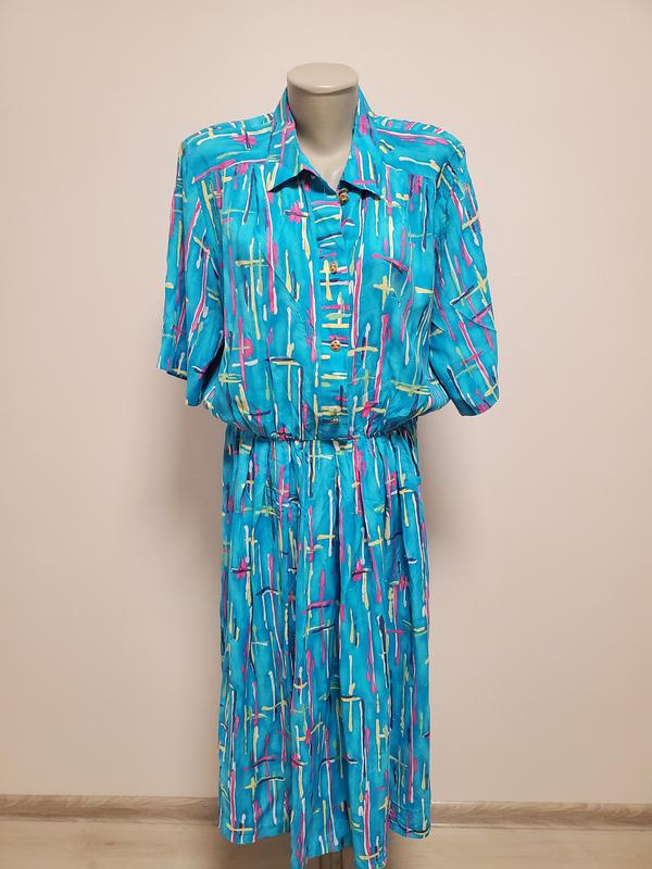 Ткань мягкая, легкая, приятная на ощупь, талия на резинке, есть боковые карманы, пуговицы растекаются до талии. Можно носить с поясом, с напуском. ПОГ 62, ПОТ 37-56, ПОБ 100, плечи 45, рукав 34, длина от плеча до талии 49, длина от плеча до низа 122 см. Без следов ношения.