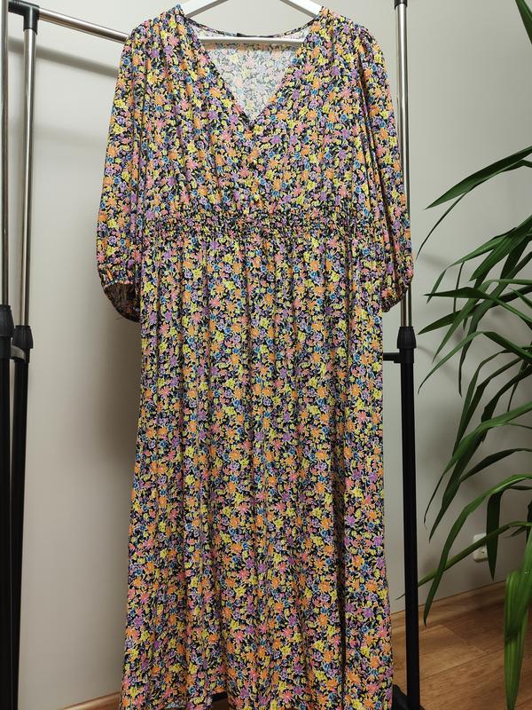 Опис продукту • Округлий виріз • Рукави завдовжки 3/4 • Талія з призбиранням • Яскравий квітковий принт по всій поверхні • Довжина міді Склад тканини: 100% Віскоза Пог60 Пояс 46-65 Бедра 75 довжина від плеча 120 плечі 42 •