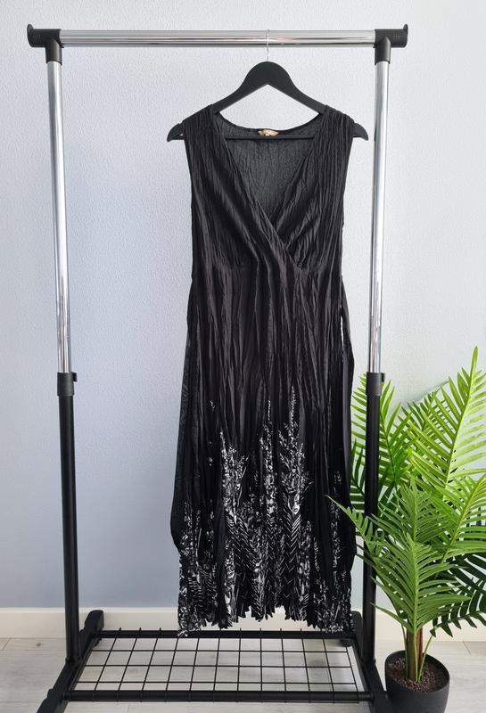 Сукня міді з декольте на запах та зав’язками з боків. Лінія талії завищена. Матеріал плісерований шифон. Всередині є підкладка, не просвічує. Рекомендую на зріст 170-175 і розмір 12-14. Заміри: напівобхват грудей - 48 см (тягнеться до 55 см) напівобхват талії - 41 см (тягнеться до 48 см) напівобхват стегон - 60+ см довжина - 114 см Склад: 100% поліестер