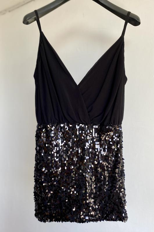 Черное платье с широким вырезом, размер С, с пайетками, сбоку есть замочек для удобства. Если нужны будут замеры или возникнут вопросы — убирайтесь в чат.