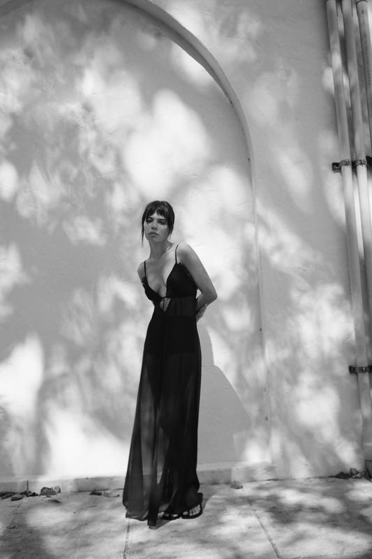 в наявності Сукня з напівпрозорої тканини. Довгий крій. V-подібний виріз. Тонкі бретелі. Декоративні волани та виріз на грудях. ЗОВНІ ОСНОВНА ТКАНИНА 100% поліестер ДОДАТКОВА ТКАНИНА 100% поліамід СЛИЗОВА ОБОЛОНКА 100% поліамід за біркою С, може бути на струнку М