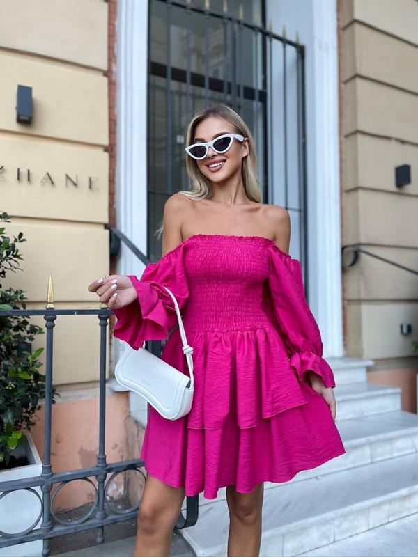 Льняное платье с пышной двойной юбкой с резинкой на груди и спинке длинными объемными рука...