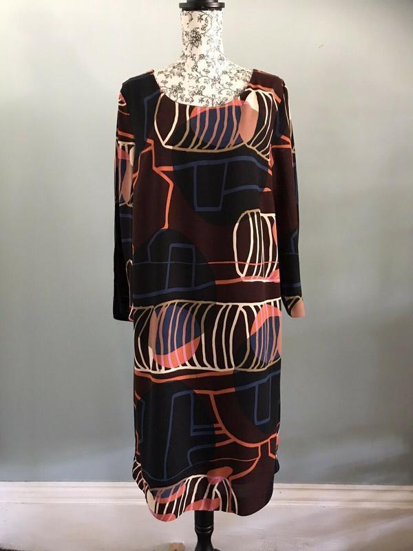 100% вискоза платье white stuff р. 18 Красивое абстрактный принт, ровный крой, рукав укороченный, ткань приятная, бархатистая на ощупь. Замеры: длина по спинке - 106см, Пог-57см, ПОБ-63см. рукав 52см. плечи-49см. Стан - новый.сток Цена - 450 грн.