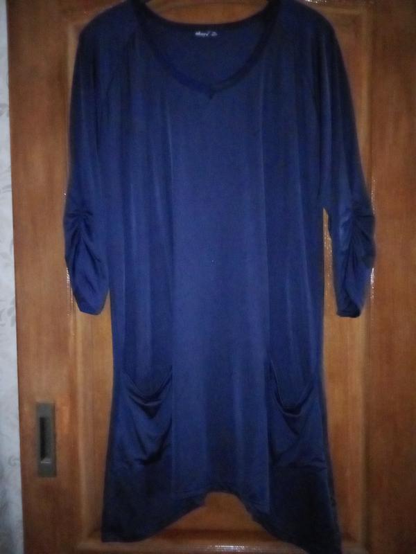 Цікавий пошив, легка тканина. Довжина рукава від горловини 62 см, трішки зібраний вгору, там довжина 56 см, ПІГ 63 см-- тягн до 80 см, ПІТ 61 см, ПІС 68 см, довжина збоку по кутам 100 см, по спинкі 90 см, є кишені. Без дефектів. Колір темно синій.