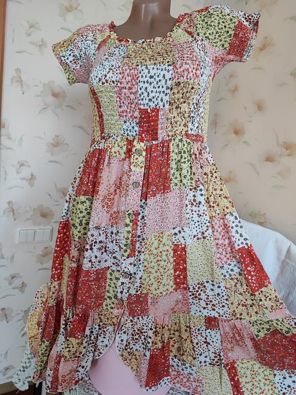 Оригинальное брендовое платье из лёгкой непрозрачной ткани. Юбка расклешенная, с широким воланом, спереди на пуговицах. Укороченный перед. . Длина спереди 90 см., по спинке 125 см. ПОГ-ПОТ-ПОБ 38-38-68 см. До пояса корсетного типа, тянется до 54 см. Короткий рукав 16 см. Глубокий вырез декольте, полуоткрытая спина. Ткань качественная, очень лёгкая, не линяет и не выгорает на солнце, не парит. Смотрится очень эффектно и стильно. Состояние идеальное. Следы ношения отсутствуют. Дефектов нет.