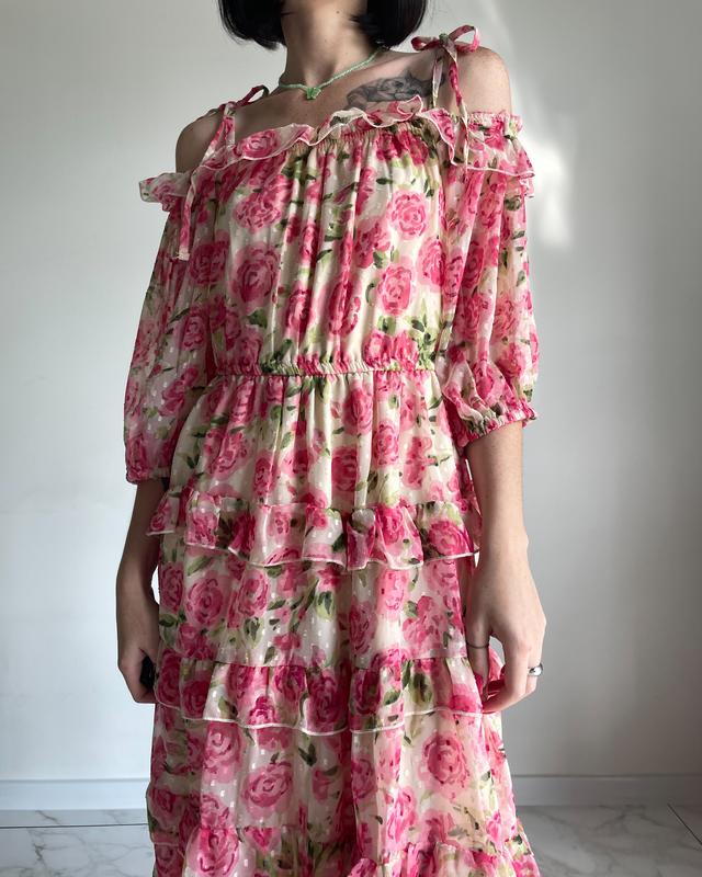 Нежное шифоновое платье в розы Длина меди Есть подкладка Лямки на завязке, можно регулировать длину Размер UK 14, M/L