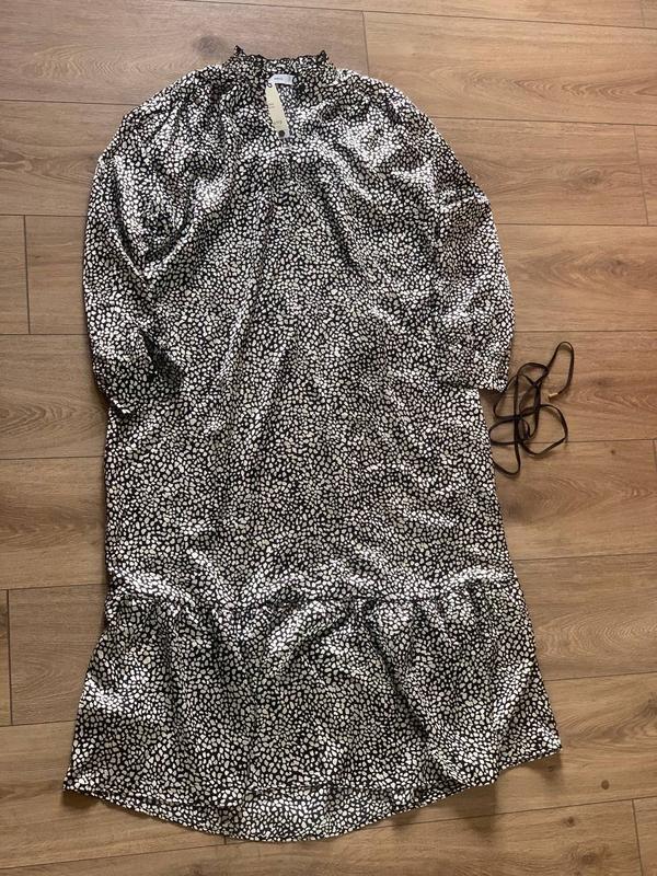 Жіноча сукня вільного крою. Низ сукні декорований воланом (не пишним), на рукавах є манжети, а на комірі - ґудзики. Довжина - між міді та максі. Матеріал - recycled poliester. Сукня абсолютно нова, мені не підійшла за розміром.