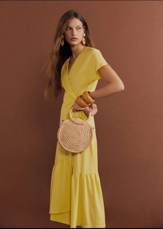 Легка міді сукня на запах від Mango. Струмуюча натуральна не парка тканина. Волани по подолу Дуже приємний трендовий в 2025 жовто-лимонний колір. За рахунок запаху розмір можна регулювати. Довжина мідаксі - між міді та максі Одягла пару раз для прогулянки і фото - ідеальний стан Склад вказан на сайті Mango : 100% ліоцелл (бірку зрізала) - схоже на віскозу.
