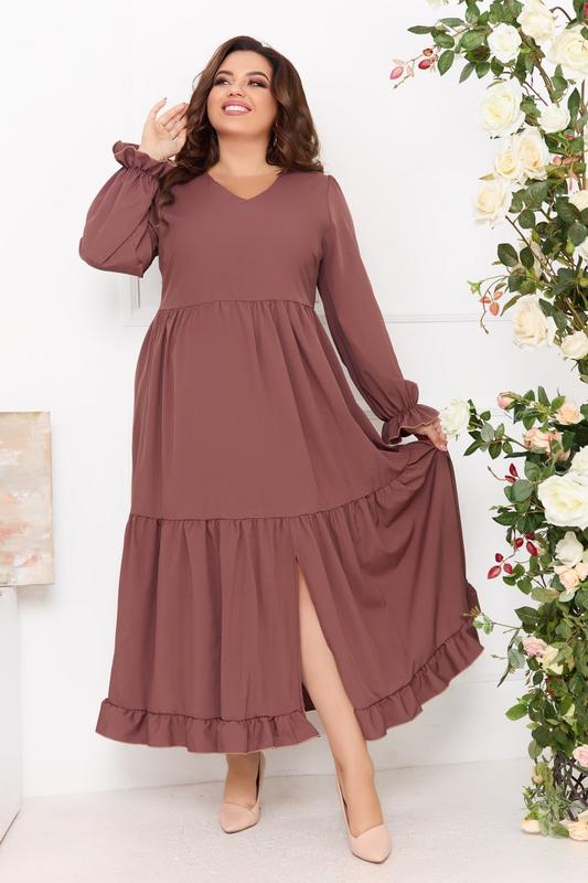 Сукня Наличие размеров ниже Код 3514 Тканина: софт. Цвета: черный, мокко, марсала, зеленый, красный, ярко-синий. Размеры: 48-50, 52-54, 56-58, 60-62, 64-66. Длина платья: 134, 135, 136, 137, 138 см. Длина рукава: 62, 62, 62, 62, 62, 62 см. Обхват рукава: 42, 44, 46, 48, 50 см. Длина лифа: 42, 43, 44, 45, 46 см. Замеры готового изделия: 48-50 ОГ 104 ОТ 93 ОС 172 52-54 ОГ 112 ОТ 101 ОС 180 56-58 ОГ 120 ОТ 108 ОС 190 60-62 ОГ 128 ОТ 115 ОС 200 64-66 ОГ 136 ОТ 122 ОС 210 Невероятно красивое платье из софта (ткань растяжимости не имеет). Вырез горловины V-образный. Рукав втачной, длинный, декорированный оборкой. Низ платья выполнен из двух широких ярусов. По нижнему ярусу спереди декоративный разрез. Застежек, карманов нет.