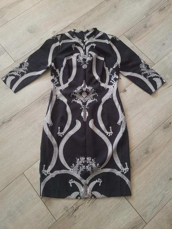 Платье новое, застежка на спинке, со шлицей, хорошо тянется. Спереди пуговица металлический. Без подкладки. Тканина цупка. Состав ткани 95% полиамида + 5% эластана. Указан размер 38.