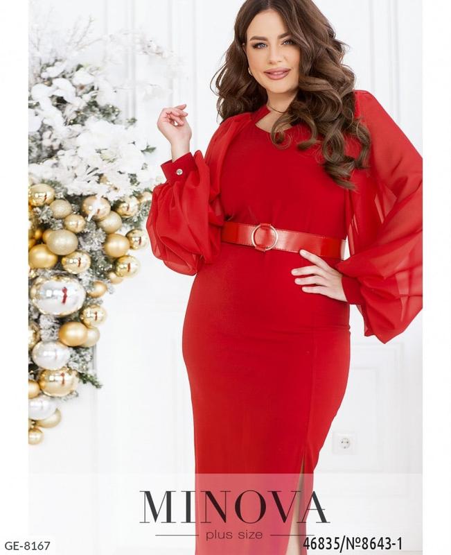 Сукня GE-8167 модель: 8643/1 Размеры: 50, 52, 54, 56 Тканина: костюмка (Анжеліка) + шифон (рукав) + ремінь Колір: червоний Довжина: 124см Довжина рукава від горловини: 79-80см (+1см)