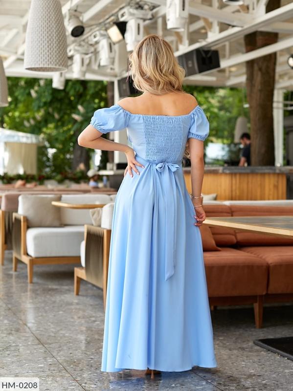 Сукня HM-0208 модель 3067. Размеры: 42, 44, 46 Тканина: американський софт. Ззаду фіксується резинкою і затягує пояс талію. Спідниця трохи расклешена. Довжина 143 см. Довжина рукава 18 см. Груди. 42рр – 86 см. 44рр – 90 см. 46рр – 94 см. Стегна. 42рр – 86 см. 44рр – 96 см. 46рр – 100 см.