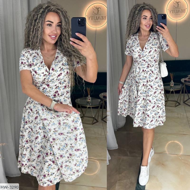 Сукня HW-3290 Модель: 0112 Размеры: 42-44, 46-48 Тканина: софт Кольори: білий і рожевий квітка, білий і фіолетовий квітка, жовтий, чорний Сукня На запах