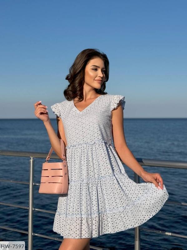 Сукня HW-7597 модель 4409-41459 Размеры: 54-56 Тканина: прошва + підклад 100% коттон Колір: Небесний Замір: 54-56 ОГ 120, ОТ 112, ОС 156, Довжина-96