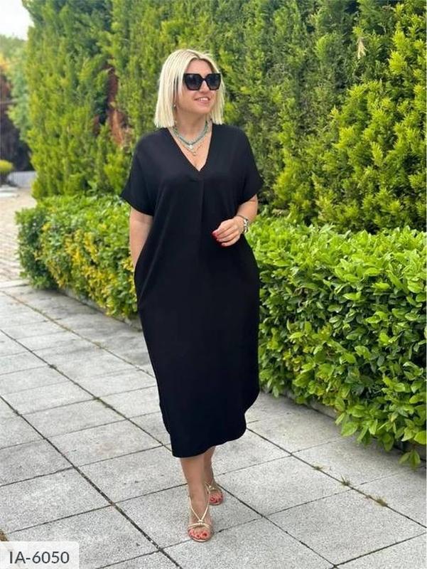 Сукня IA-6050 Модель 042VK Размеры: 50-52, 54-56, 58-60, 62-64 Колір: електрик, чорний, беж, хакі Тканина: американський креп Сукня вільного крою (не кошлатиться, приємна на дотик, легка і не парить) Довжина ідеально підійде на будь-який зріст, рукави доломан, збоку внизу розрізи, кишені з обох боків, v-подібний виріз з цікавою складкою на грудях. Параметри моделі-батала брюнетки ОГ 110, ОТ 88, ОС 112, зріст 165см, на ній одягнений розмір 50-52.