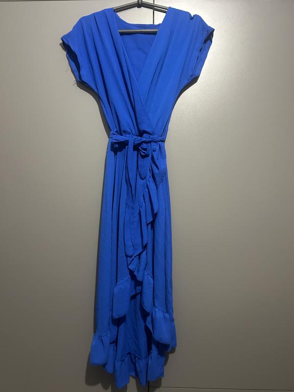 Сток новинка 5/5 цвет как на фото яркий синий ( индиго) Длина -спереди 103 см, по спинке-123 см Полу обхват груди-50 см но тянется хорошо Полу обхват талии- 30 до 56 см тянется резинка + поясок есть Полу обхват бедер- открытые ножки свободный крой -65+