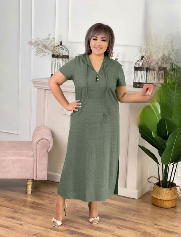 Сукня 🔵Мод 023 🔵Тканина: лакоста літня ( має гарну розтяжність) 🔵Кольори: хакі 48-50, 52-54, 56-58 графіт 48-50,52-54,56-58 моко 52-54,56-58 трава 48-50,52-54,56-58 електрик 48-50,52-54,56-58 Виміри👇👇👇 🟡48-50 ОГ108, ОС 118 см. Довжина рукава 22 см, пройма 23 см. 🟡52-54 ОГ116 , ОС 126 см. Довжина рукава 22 см, пройма 24 см. 🟡56-58 ОГ124, ОС 134 см. Довжина рукава 22 см, пройма 25 см. Довжина виробу 115 см