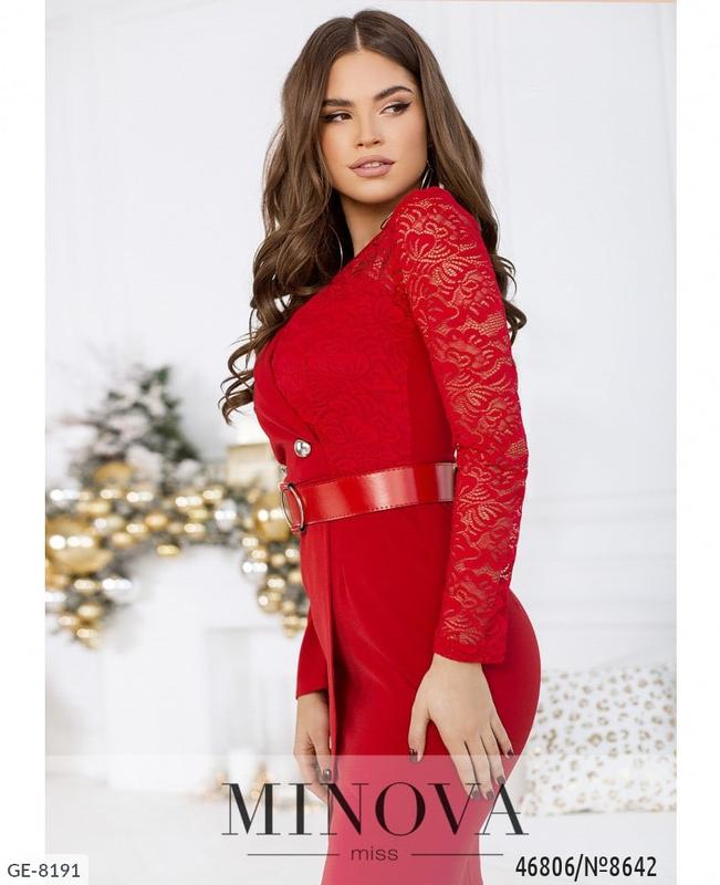 Сукня GE-8191 модель: 8642 Розміри: 42, 44, 46, 48 Тканина: костюмка (Анжеліка) + гіпюр + ремінь Колір: червоний Довжина: 96-99см (+1см) Довжина рукава: 58см