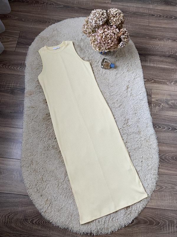 Приталенное платье под шею без рукавов бледно лимонного цвета размером М, красиво тянется, можно L, состав полиэстер и вискоза, длина 120см., полуобхват груди 40см., низ 40см. Стан идеален.