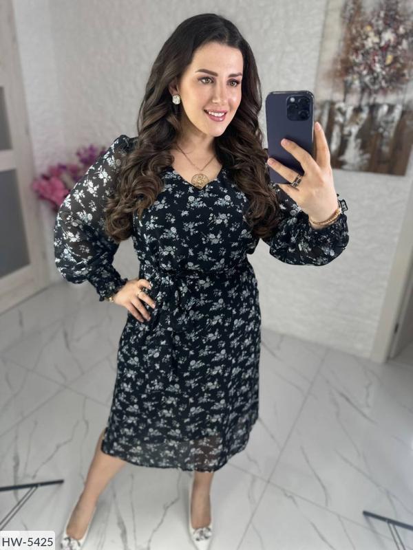 Сукня HW-5425 Модель 951vl Размеры: 50-52, 54-56, 58-60 Принт: чорний + білі квіти Тканина: шифон, літня трикотажна підкладка Вільне плаття, з боку розріз, талія фіксується поясом з основної тканини (пояс входить в комплект), довгий рукав, по низу ряд резіночек, на грудях виріз. Параметри моделі 108-86-112, на ній представлений розмір 50-52. Заміри сукні по зовнішньому шву: Розмір 46-48: Об'єм грудей 104 Об'єм талії 104 Обсяг стегон 110 Довжина рукава 61 Довжина по спинці 104 Біцепс 42 Висота розрізу 20 Плечі 37 Довжина пояса 180см Розмір 50-52: Об'єм грудей 112 Об'єм талії 112 Обсяг стегон 120 Довжина рукава 62 Біцепс 45 Довжина по спинці 110 Висота розрізу 22см Довжина пояса 190см Розмір 54-56: Об'єм грудей 120 Об'єм талії 120 Обсяг стегон 130 Довжина рукава 63 Біцепс 48 Довжина по спинці 110 Плечі 41 Висота розрізу 27 Довжина пояса 200см Розмір 58-60: Об'єм грудей 128 Об'єм талії 128 Обсяг стегон 140 Довжина рукава 63 Довжина по спинці 111 Біцепс 51 Плечі 44 Висота розрізу 29 Довжина пояса 210см