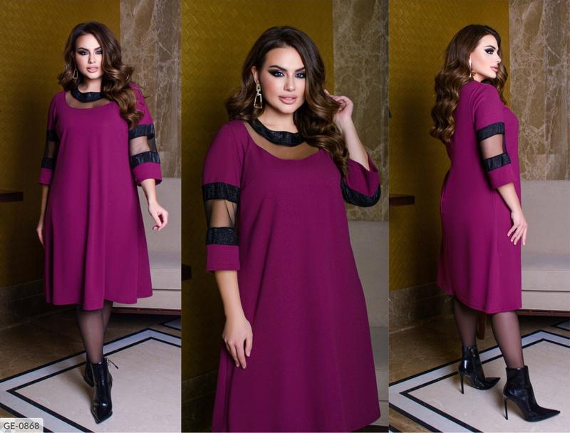 Сукня GE-0868 1281 Размеры: 50-52, 58-60, 62-64, 54-56 Колір: електрик, Фуксія, беж , Хакі, чорний. Тканина про-во Туреччини: креп дайвінг, паєтка. Жіноче плаття розширеного до низу силуету. Обробкою служить прозора сітка і тканина з паєтками. Рукава втачні, розширені до низу. На рукавах є горизонтальні вставки з сітки, які обрамлені деталями з паєток. Виріз горловини округлий, оброблений вузькою обтачкой з паєток. Також по переду в області горловини є деталь з сітки. Спинка із середнім швом, в якому розташовується застібка на гудзик. У такій сукні будь-яка жінка зможе відчути себе справжньою леді і королевою вечора, це плаття здатне надати жінці ніжності, легкості і елегантності. Розмір 50-52: Сукня 105 см, рукав 42 см, ог - до 110 см, від-до 110, об - до 120 Розмір 54-56. Сукня 107 см., рукав 43 см, ог-від 110-до120 см, від - 120см, об-до 130 см. Розмір 58-60. Сукня 110 см., рукав 44 см, ог - від 120-до130 см, від - до 130 см, об - до 140 см. Розмір 62-64. Сукня 114 см., рукав 45 см, ог-від 130 - до140 см, від - до 140см , об-до 150 см.