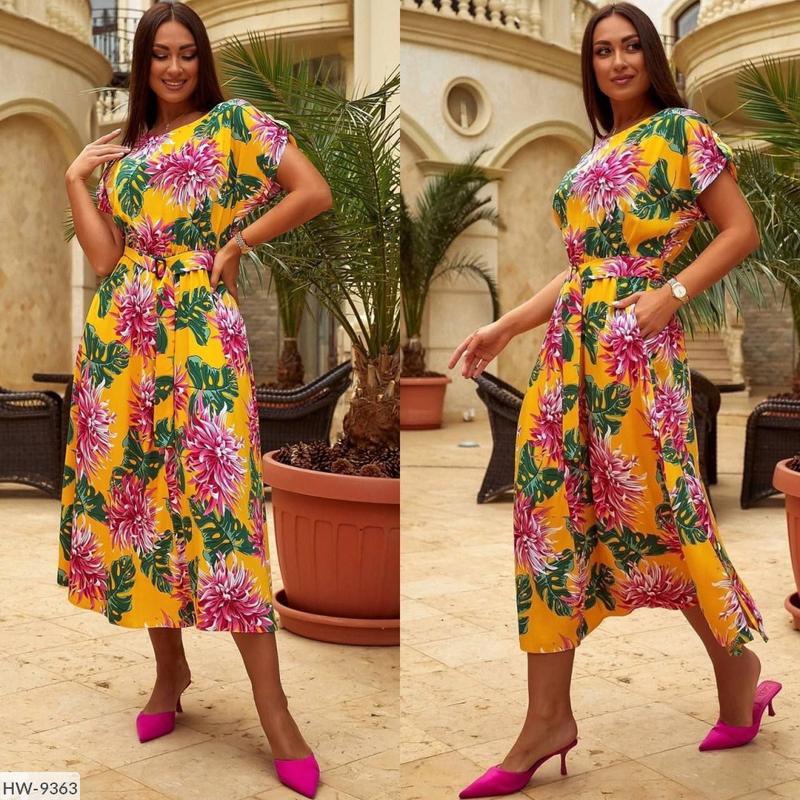 Сукня HW-9363 модель 4409-63 Размеры: 50-52, 54-56 Тканина: софт Колір: жовтий Пояс в комплекті, талія резинка гудзики по низу сукні Декоративні Замір: 50-52 ОГ 112, ОТ 78/110, ОС 140, довжина-130, рукав-25 54-56 ОГ 120, ОТ 80/112, ОС 150, довжина-134, рукав-27