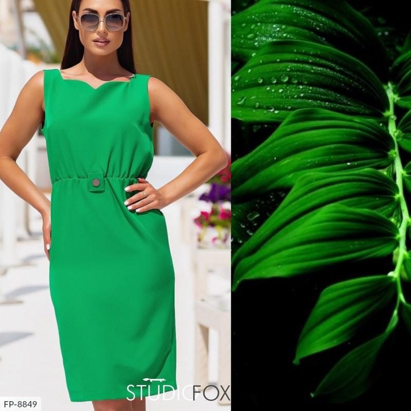 Сукня FP-8849 Мод SF 234- 2017 Размеры: 48, 50, 52, 54, 56, 58, 60, 62 Сукня напівприлягаючого силуету кольору яскравої зелені Тканина: котон Блискавка з полірованого металу по центру спинки Пояс сукні оброблений ніжною, широкою потайною еластичною тасьмою Ґудзик-пряжка з полірованого металу Довжина виробу ОТ 1 м 06 - 1м 08 см по центру спинки Довжина виробу пропорційно збільшується від розміру. Атласна обробка внутрішніх швів