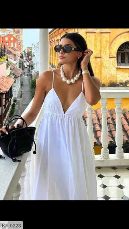 Сукня KF-0223 Мод. 127 Размеры: 42-46 Літнє плаття Тканина: турецький коттон 100% Колір: Білий, чорний Хіт цього літа елегантне плаття, на регулюючих брительках з відкритою спиною і V-подібним вирізоммолодіжний і шикарний з еластичною резинкою на талії Приємна і лекгкая тканина на дотик Хороша якість Відмінна якість