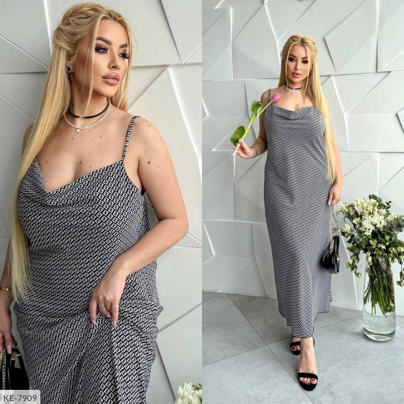 Сукня KE-7909 Мод. 280 Размеры: 50-52, 54-56 Сукня-комбінація Прекрасно підкреслює силует, красиво сідає по фігурі. Довжина-міді. Особливість моделі-провисання в області декольте і тонкі бретелі з регуляторами для зручності. Матеріал: шовковий софт Кольори: принт