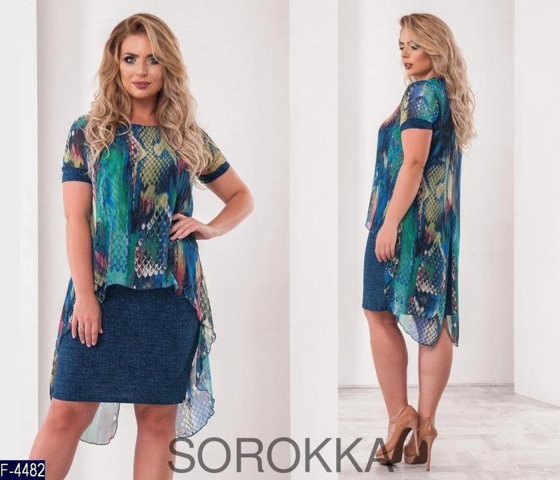 Платье F-4482 Размеры: 50, 52, 54, 56, 58, 60 Мод 333 Ткань:масло джинс+шифон Длина изделия: 105 см. Длина рукава: 51\37 см.
