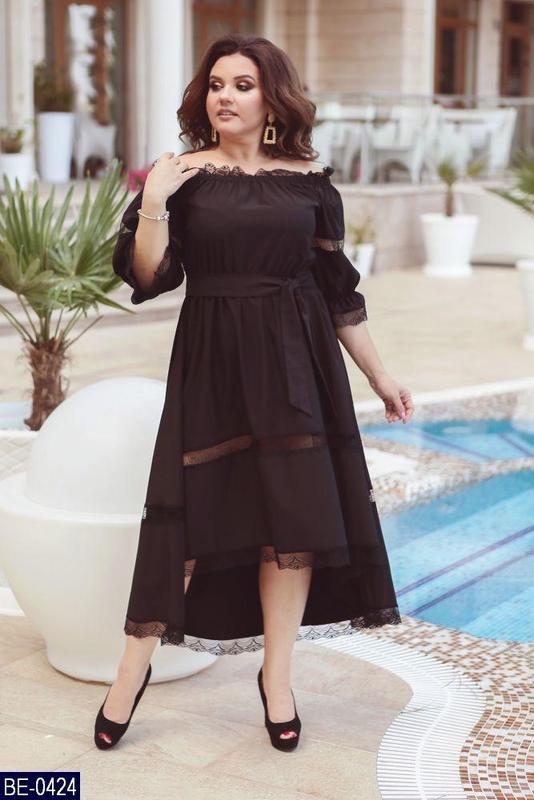 Платье BE-0424 код 3144 Размеры: 48-50 Цвет: черный Ткань: армани коттон Платье с асимметричной юбкой в романтическом стиле, отделано кружевом. Пояс из основной ткани в комплекте.