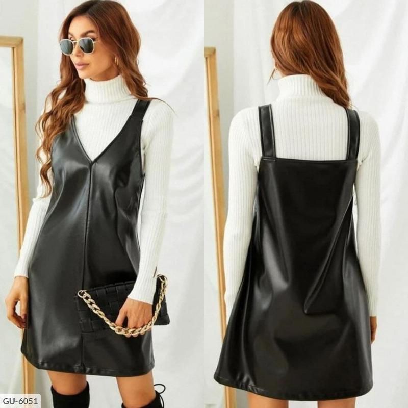 Сарафан GU-6051 модель 1084 Размеры: 42-44, 46-48 Тканина еко-шкіра Колір чорний Універсальна модель. Можна носити з гольфом, блузою, сорочкою, кофтою.