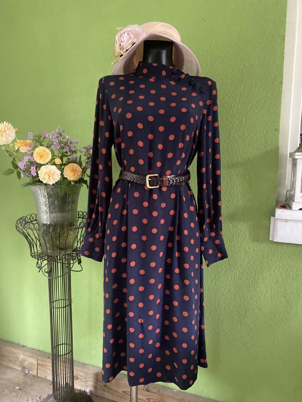 Отличное платье миди от Hobbs. Цвет:темно-синий в горох. Состав:вискоза-100/. Без подкладки, застежка-молнию в боковом шве, на плече пуговицы обтянуты тканью постегиваются (утрачено 2 пуговицы), рукав на манжете с такими-же пуговицами, Размер по бирке-14. Замеры: длина-110 см, ПОГ-50 см, ПОТ-40 см, ПОБ-52 см, рукав-62 см.