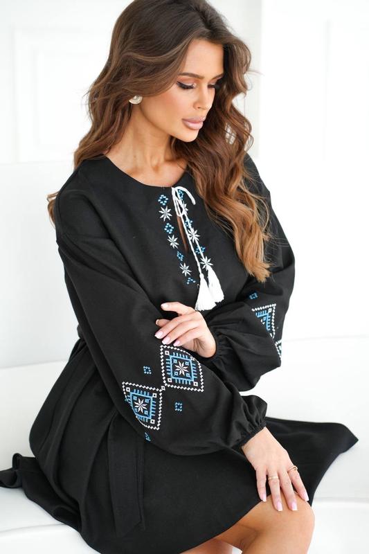 Модель 7514tiv Размер S-M (42-44), L-XL(46-48) Тканина: льон +вишивка Льняное платье с вышивкой и расклешенной юбкой. Талия на резинке и поясом красиво подчеркивающим талию. Горловина прекрашена китицями. Рукава на резинке. Длина: 90 см Рукав: 50 см (спущений рукав) Цвета: черный, голубой, молочная