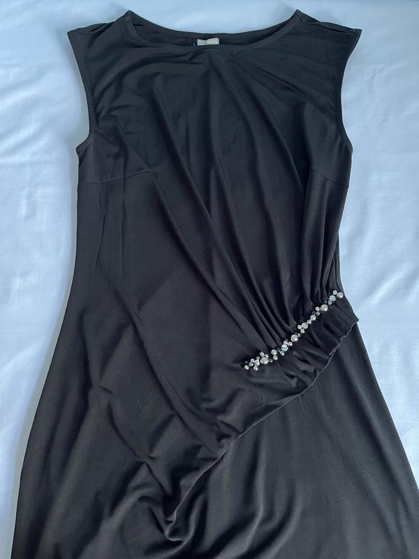 Склад: 95% поліестер, 5% еластан Колір - чорний з сріблястими бусинками Розмір: S (M) Красива чорна сукня нижче колін без рукавів