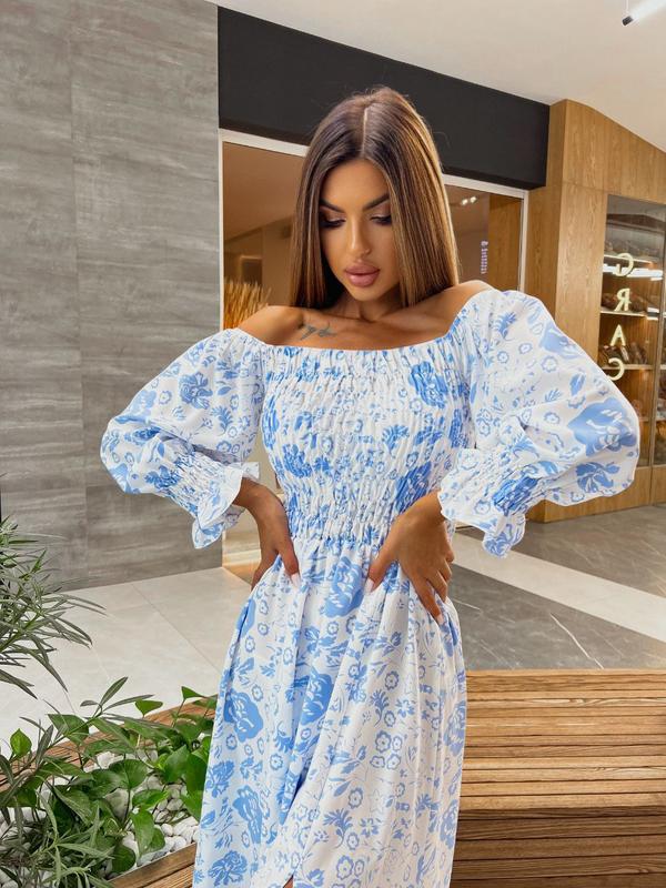Модель 7001 Жіноча сукня Розміри 42-46, 48-52 Тканина софт , приятний на дотик Модель дуже стильна, легка, ідеально підійде під різне взуття, зі стильною в цьому році настрочною резинкою по грудях Супер якість