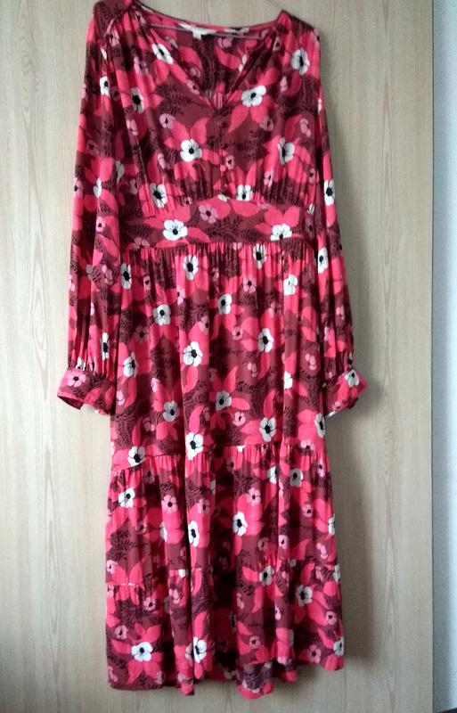 Красива квіткова сукня з пишними рукавами, поиталеного силуету. Попереду є гудзики обтягнуті тканиною, на манжетах рукавів теж такі. Також сукня має дві кишеньки по бокам і волани - яруси по низу . Заміои: Ог - 104см, от - 84см., довжина - 120cм.