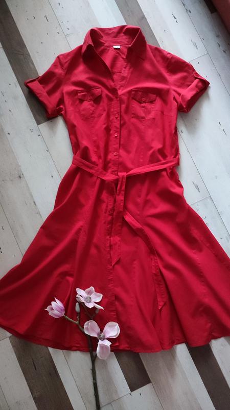 Очень яркое,красное платье застегивается на пуговицах впереди. Без подкладки. Впереди на груди карманы. Крой платья расширен клиньями к низу. Рукав до локтя, но можно делать подворот на пуговицах. Платье мое. Срезала бирку с составом . Но, это точно хлопок. Имеется пояс. Мои замеры: Плечи: 43 см; ПОГ-56 см; ПОТ- 51 см; Длина- 118 см; Рукав- 28 см без подворота.